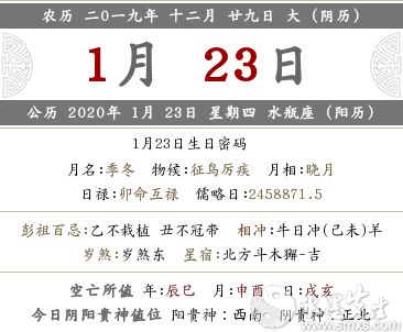 公历 2020年 1月 23日 星期四 水瓶座 (阳历)