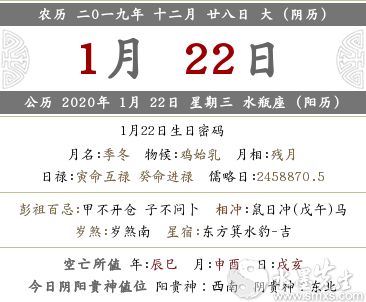 公历 2020年 1月 22日 星期三 水瓶座 (阳历)