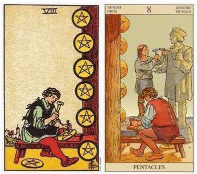 金币八是一张工作的卡,代表财富的积累,专注于赚钱,金币三个更像是专注于工作本身。金币不分为劳动合作,这是一种集中生产,或个人努力和结果。偏见创造和学习,长期积累的经营业务和成就。从图片中的男人“创造钱”,你可以知道这项工作和生产,目的是赚钱。他的目的是非常实用的,当然,不要忘记严肃的奉献精神。 五悬的金币是结果,也是已预订的成品,代表得到了奖励。它也是一个展示声誉的节目,他仍在努力工作。这些金币是他的结果,它也是他的实际财富,这是一个累积,确切的特定劳动力。因此,这张卡代表直接收入,服务和面部客户成分不大,工作将有一份工作。做固定程序,将有一个固定的薪水,收入保证,不可避免地形成长期稳定的累积节省。 直接生产金币,可能会让人们感受到一些技能,但它也是一个特殊的技能,所以对于工作可以断开作为一种技术,艺术和专业技能,此卡除了工作或接收商业订单,指定或乘坐办公室,是开始工作的象征。但是,也可以代表实习过程,或在试验期间,是准备或转向的阶段。它还代表了技能的技能,非常有效,学术表现非常明亮。保留未来的工作技能。无论您是在工作还是学习,您都会抱着敬业,谦虚和谦卑。它也实施了行动和实践的精神。