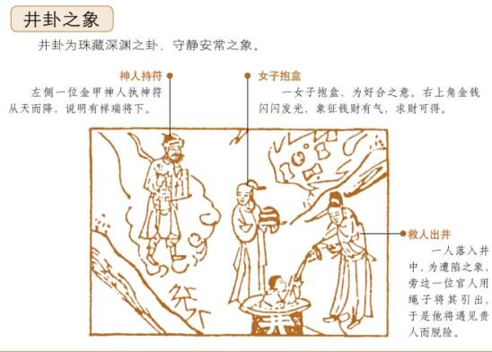 ◎并卦解曰:左侧一位金甲神人执神符从天而降,说明有祥瑞将下。下方一女子抱盒,为好合之意。右上角金钱闪闪发光,象征钱财有气,求财可得。下方有一人落入井中,为遭陷之象,旁边一位官人用绳子将其引出,于是他将遇见贵人而脱险。此为珠藏深渊之卦,守靜安常之象。