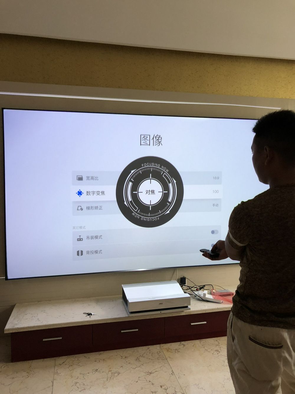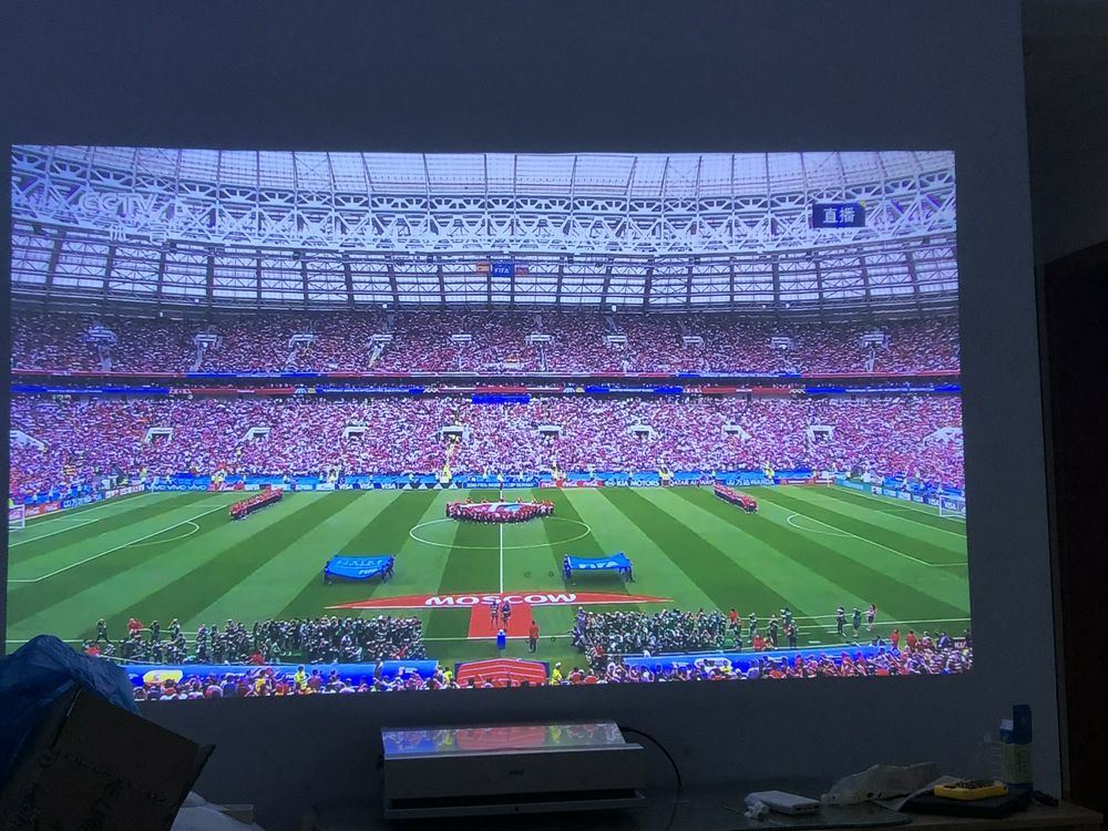 7楼回复、2018-07-04 11:01:24a***d说:大家都发的投影后的照片,我来给大家看一下贴墙四厘米是什么感觉。目前靠墙就接近四厘米,出来的画面就是一百左右,目前因为幕布还没到,看动画片因为色彩比较单一的效果还可以,直接投到墙上看电影就不行了。问了客服说还没发货,据说菲尼尔屏改成硬慕了,收到之后看看效果怎么样,再来给大家评价 幕布还没来啊啊啊?,投在家里的瓷砖影视墙上就是这个效果,可怜我现在天天这么看世界杯啊??!目前来看投影的亮度还是可以的,与家里的三星电视看起来也没有什么特别偏红色或发绿色等感觉。专门拍了一张投影仪后方与电视墙的距离大家可以看一下,如果离得更远一点,会投的屏幕更大,机器后方离屏幕4到10公分的话应该是正好的。