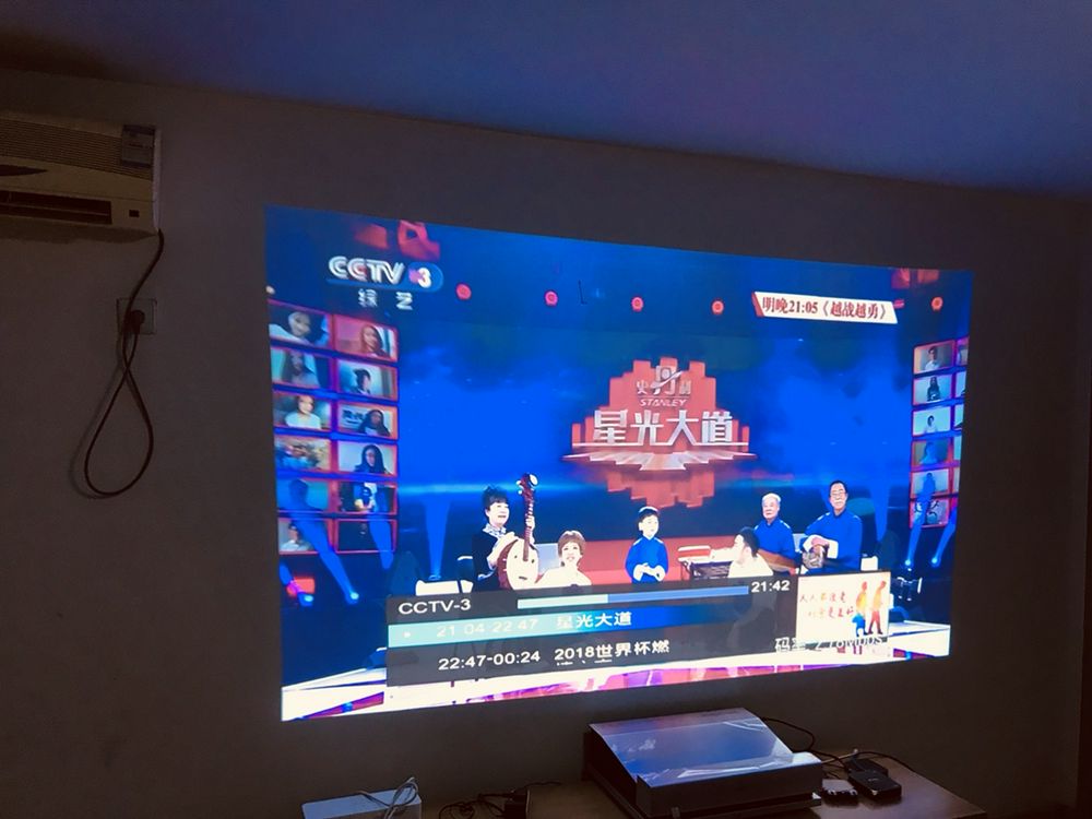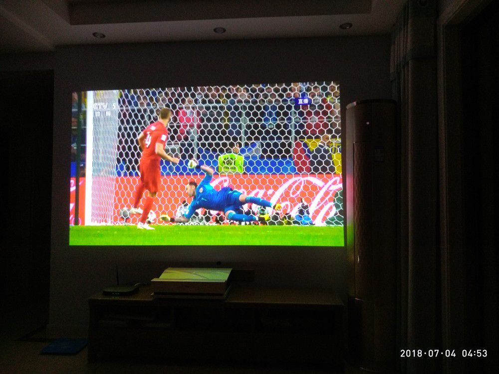21楼回复、2018-06-30 22:02:10y***2说:抗光幕没到,只能先投白墙看了,效果还不错,亮度和色彩都不错,看世界杯非常爽,不知道决赛前幕布还能不能到.图片是晚上开灯和不开灯的效果.