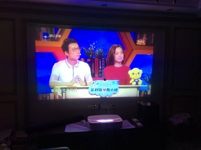 18楼回复、非常不错的激光电视,前面的图片都是配了硬屏的效果。图和第二图是晚上开了所有顶灯以后效果很棒。第三图是阴天白天没有拉窗帘的效果。还是很不错的。第四图是安装师傅在调显示范围。看了一次自己以后都会调了。第五图是没有硬屏晚上没开灯投射在背景上的效果。总的来说激光电视主机就很不错。再配上硬屏就更棒了。提示大家下:硬屏的纸板盒子相当重,光是硬屏的纸板盒子就卖了50元的废纸板钱。我这个硬屏差点上不了楼。三个男人硬是转来转去调整角度搬上楼的。电梯进不去。楼梯转角必须倾斜起来转。真的不容易。看了大电视再看小电视。真的感觉好小。 这么贵的主机一定要弄个合适的盖头。