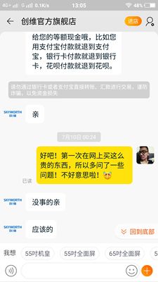 10楼回复、物流很快 包装很好 师傅帮忙抬到四楼插电试机 画质很好 屏幕足够大 喜欢 家里一共三台创维电视了