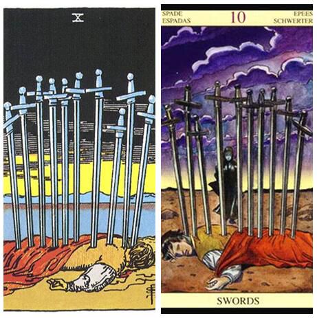 卡片名称:十剑 元素:风 代表颜色:黄色的 关键词:痛苦,结束,黎明 意义:代表不幸的,悲伤或监禁卡,否认一切好兆头。地带解释